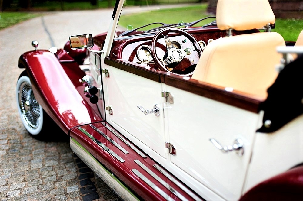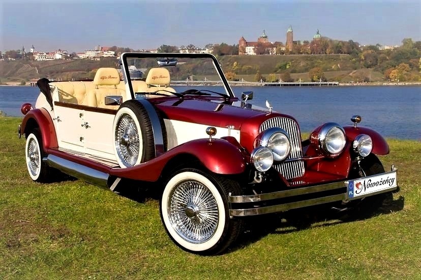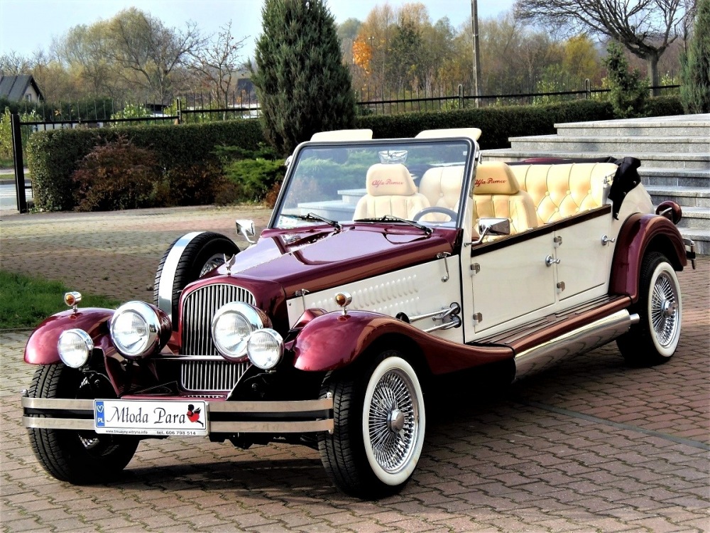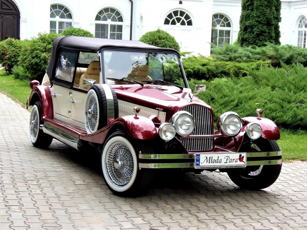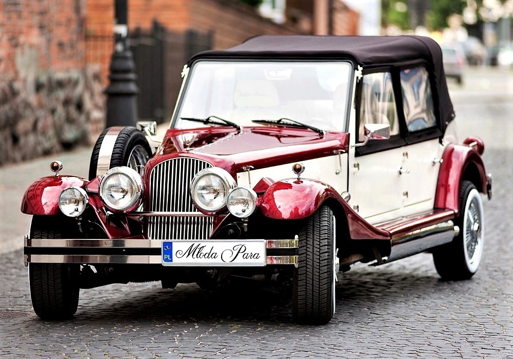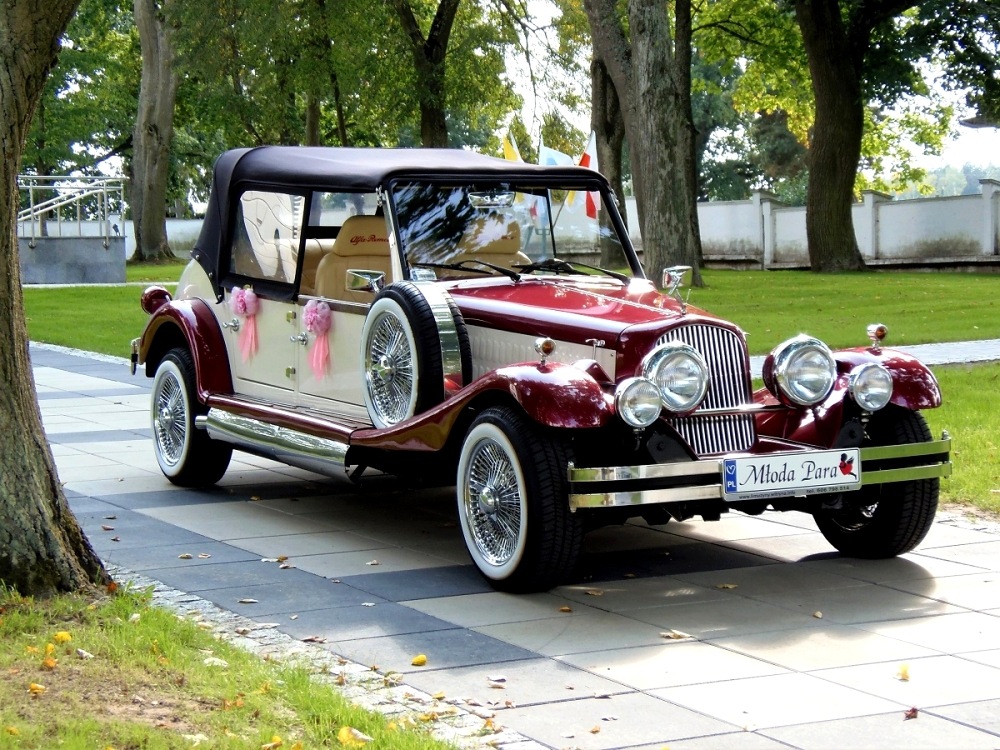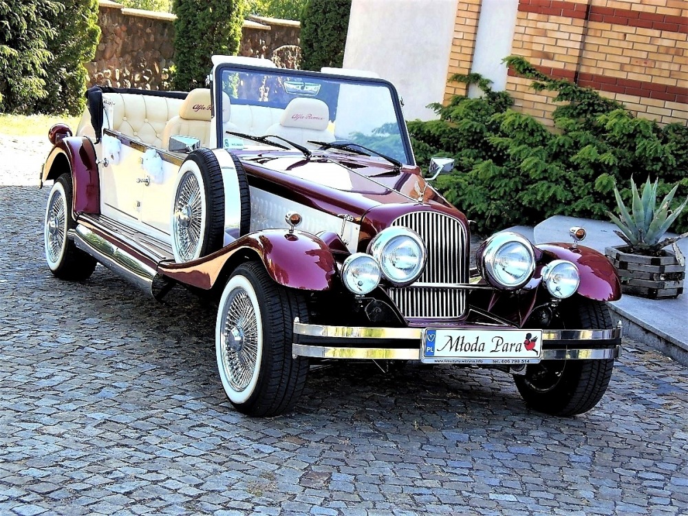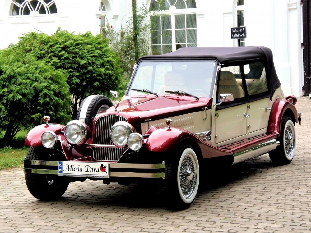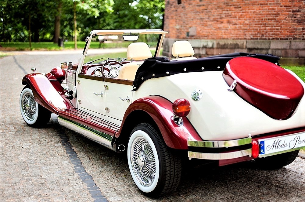 Piękne stylowe - zabytkowe auto z lat 30-tych, kabriolet w stylu RETRO. Prestiżu nadaje charakterystyczna linia nadwozia, długa maska, duże i okrągłe reflektory, szprychowe koła, opony z białym paskiem, skórzana tapicerka pokryta haftem, dodatki drewniane i duża ilość chromowanych elementów nadaje niesamowity wygląd temu samochodowi. Nadwozie tego przepięknego auta pokryte jest błyszczącym perłowym lakierem w kolorze bordowo - ecru.