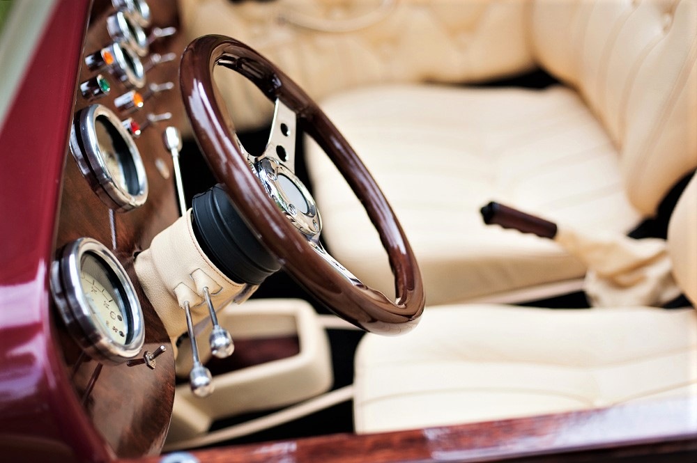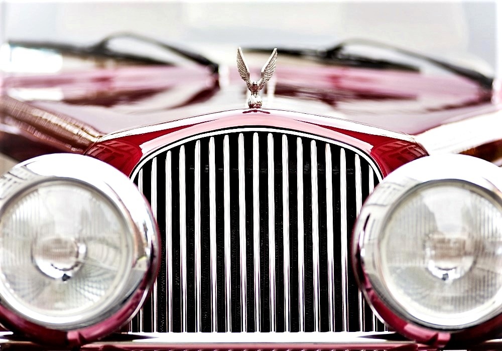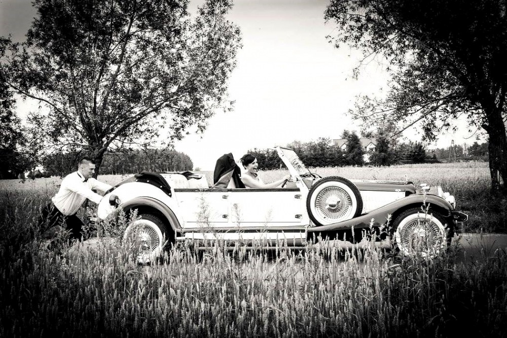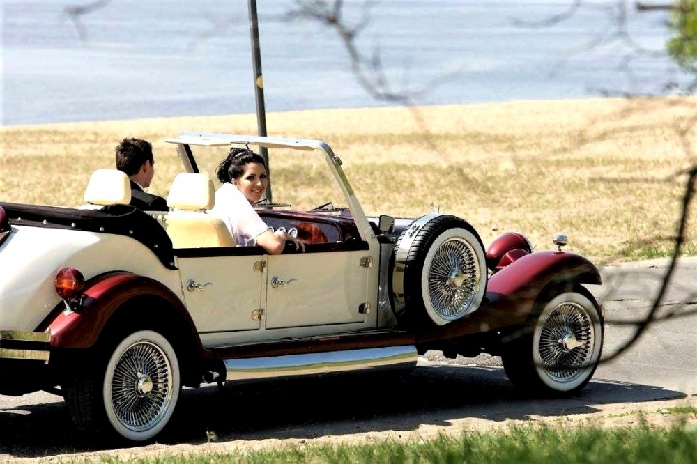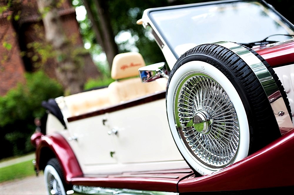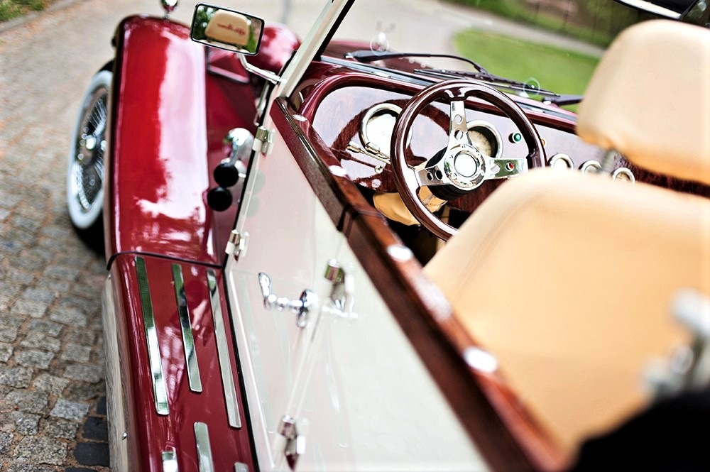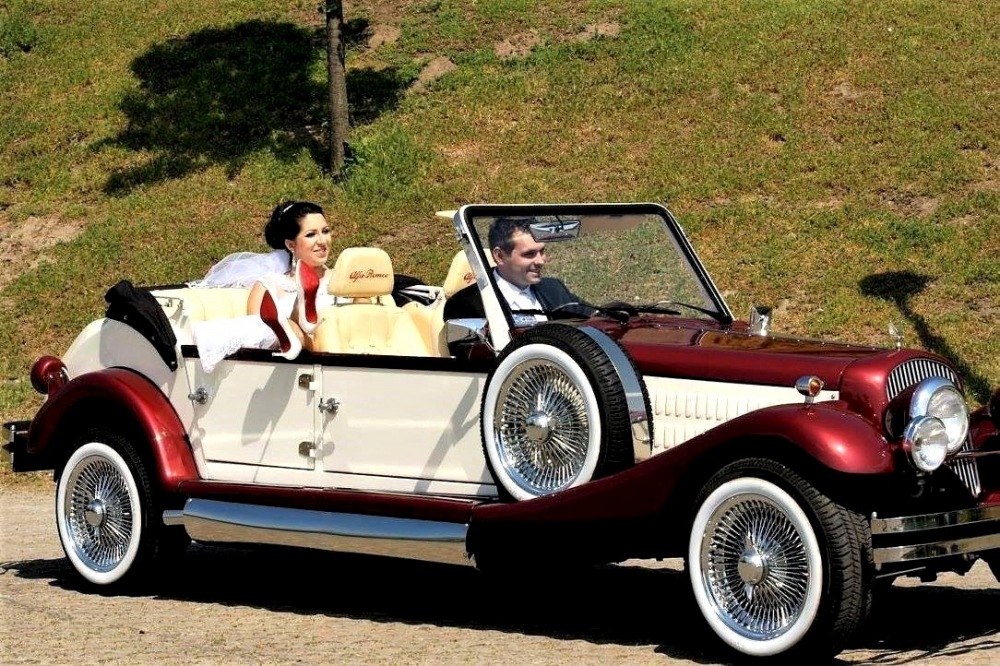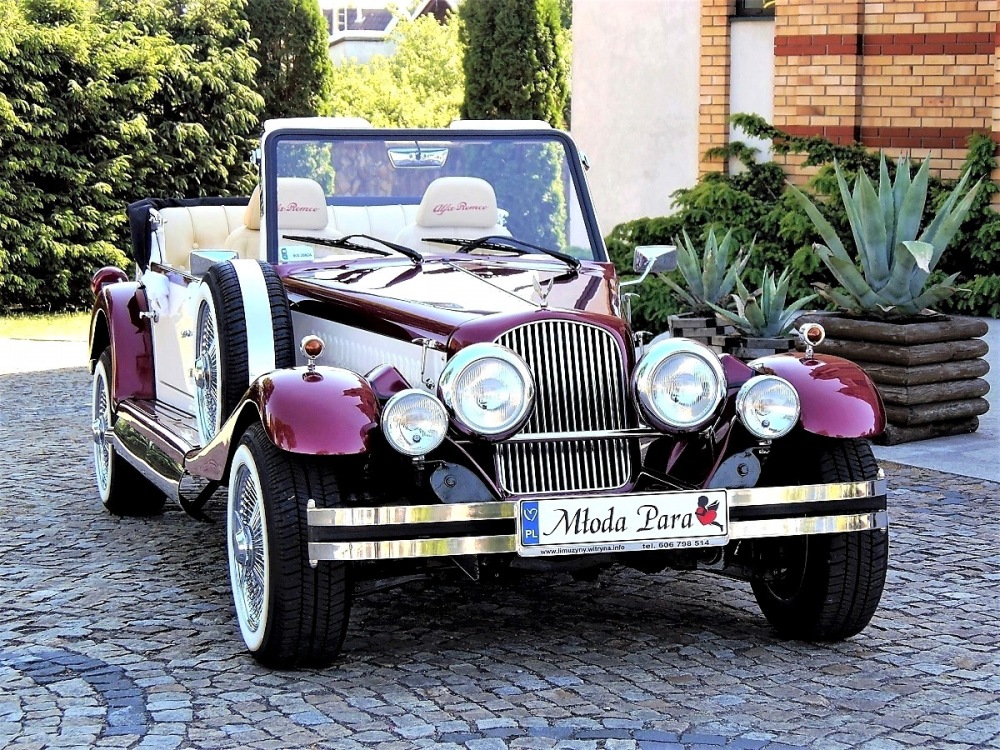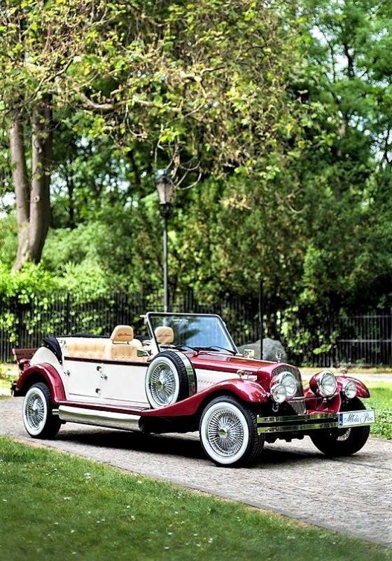 Piękne stylowe - zabytkowe auto z lat 30-tych, kabriolet w stylu RETRO. Prestiżu nadaje charakterystyczna linia nadwozia, długa maska, duże i okrągłe reflektory, szprychowe koła, opony z białym paskiem, skórzana tapicerka pokryta haftem, dodatki drewniane i duża ilość chromowanych elementów nadaje niesamowity wygląd temu samochodowi. Nadwozie tego przepięknego auta pokryte jest błyszczącym perłowym lakierem w kolorze bordowo - ecru.